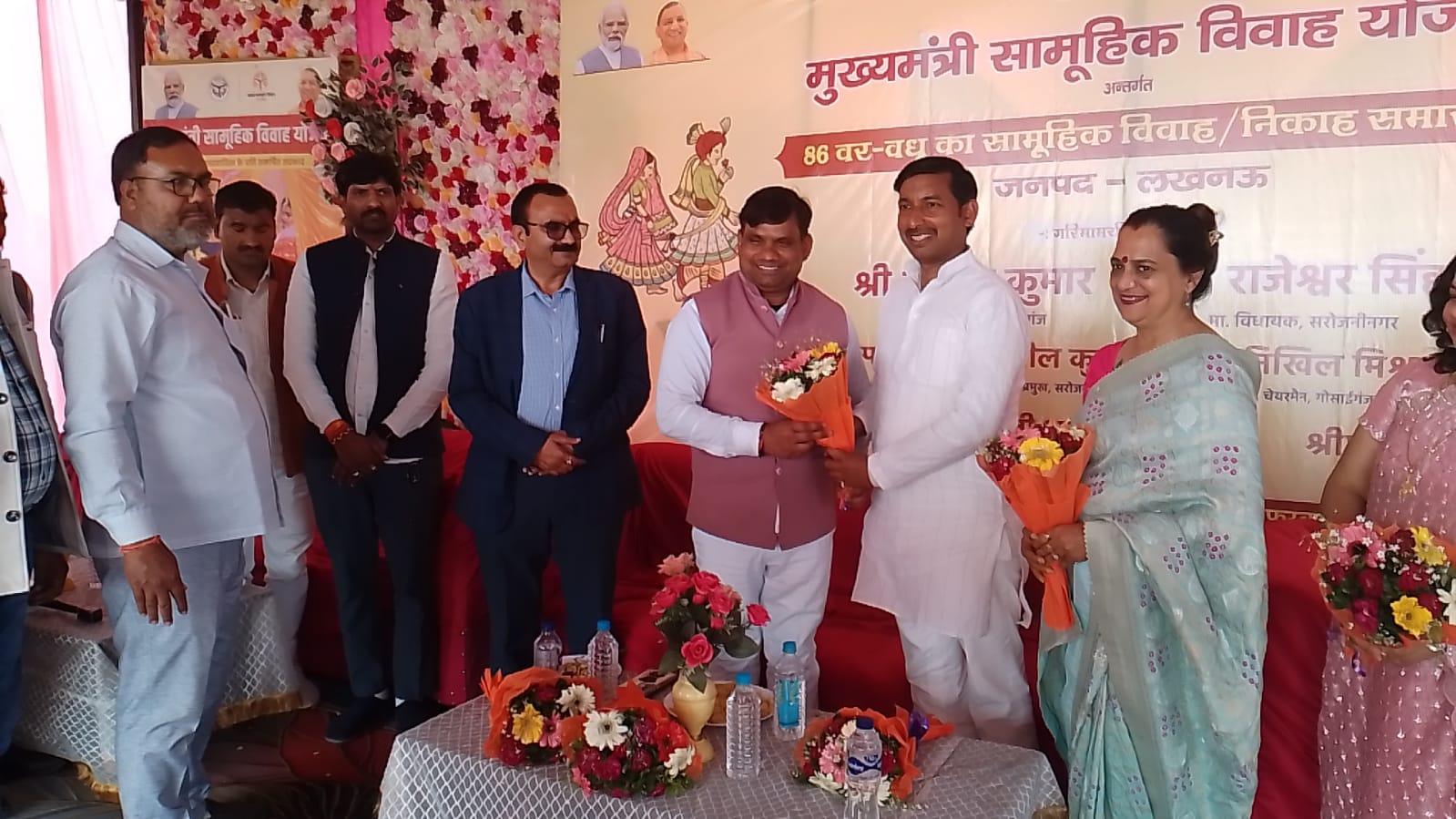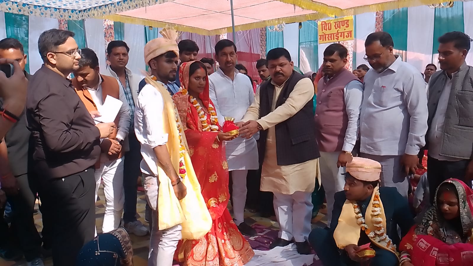 लखनऊ। खंड विकास गोसाईं गंज में दिनांक -18 फरवरी 2026 दिन -बुधवार को समय प्रातः 11: 30 बजे स्थान – विशाल लान, चांदसरांय में मुख्यमंत्री सामूहिक विवाह योजना कार्यक्रम समारोह बड़े हर्षोल्लास पूर्वक सम्पन्न हुआ जिसमें 86 वर-वधू के जोड़ों का विवाह हिन्दू रीति रिवाज के साथ किया गया जिसमें सरोजनी नगर खंड विकास क्षेत्र के 14 वर – वधू के जोड़े और 72 वर – वधू के जोड़े गोसाईं गंज खंड विकास क्षेत्र के जोड़ों का पाणिग्रहण संस्कार किया गया जिसमें गरिमामयी उपस्थिति अमरेश कुमार रावत विधायक मोहनलाल गंज, राजेश्वर सिंह विधायक सरोजनी नगर, विनय वर्मा ( डिम्पल ) ब्लाक प्रमुख , गोसाईं गंज, सुनील कुमार ब्लाक प्रमुख, सरोजनी नगर, निखिल मिश्रा चेयरमैन गोसाईं गंज, रोहित साहू चेयरमैन, काकोरी, जीनत नज़ीर चेयरमैन, नगराम, अस्मत आरा खान चेयरमैन,मलिहाबाद, रामावती रावत चेयरमैन, बंथरा सहित सभी क्षेत्रों के ग्राम प्रधानों एवं भाजपा कार्यकर्ताओं ने समारोह में उपस्थित होकर कार्यक्रम की शोभा बढ़ाई हर कन्या के खाते में 60 हजार रूपए एवं वैवाहिक उपहार 25 हजार रूपए एवं आयोजन हेतु 15 हजार रूपए सरकार द्वारा खर्च किए गए समारोह बहुत ही हर्षोल्लास पूर्वक सम्पन्न हुआ।